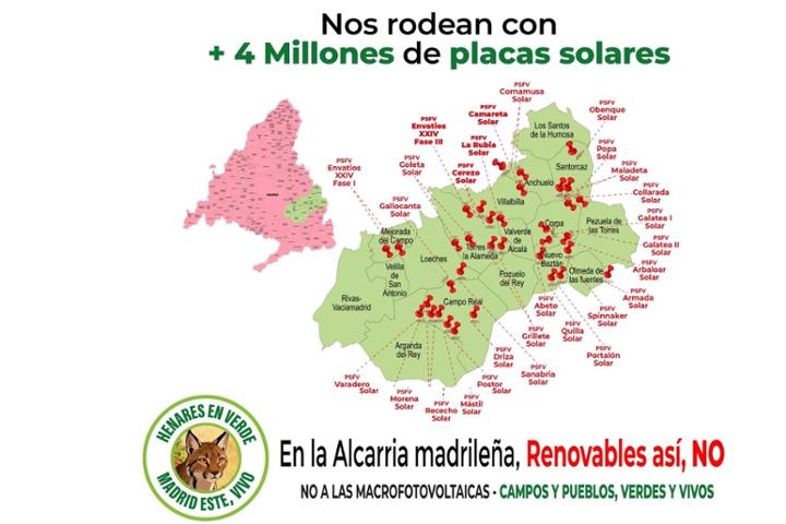 Henares en Verde surge en un momento crítico y determinante para el futuro del territorio de la Alcarria Madrileña. En la actualidad, se están tramitando y proyectando múltiples macroplantas fotovoltaicas en con más de 4 millones de placas solares sólo en esta zona, centros de datos, subestaciones transformadoras y líneas de alta tensión. Todo próximo a núcleos residenciales, con gran impacto sobre la flora y la fauna de la zona. Nuestro objetivo es paralizar la implantación de dichas plantas.